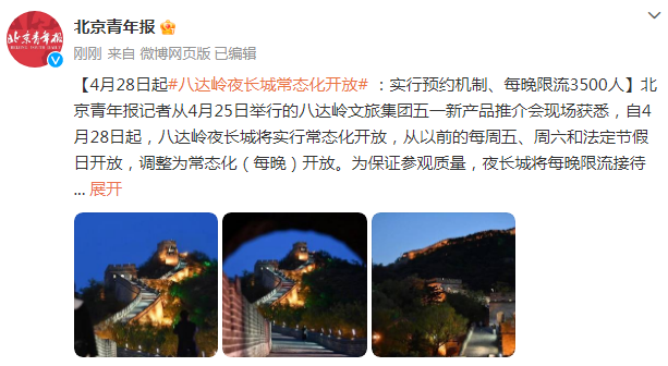 4月28日起八達(dá)嶺夜長(zhǎng)城常態(tài)化開(kāi)放:實(shí)行預(yù)約機(jī)制、每晚限流3500人