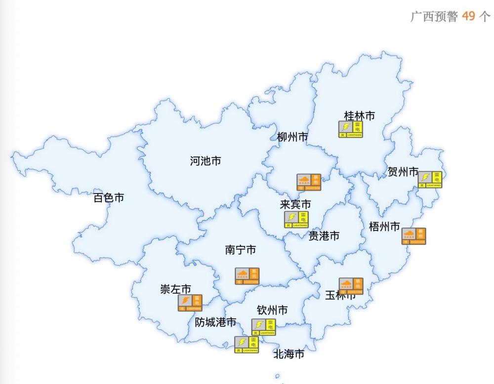 今天(24日),廣西南寧、梧州、玉林等地相繼發(fā)布暴雨、雷電等各類氣象預(yù)警信息,提醒公眾注意做好相關(guān)防范工作。截至24日上午9點(diǎn)30分,全區(qū)各類預(yù)警信息49個(gè)。