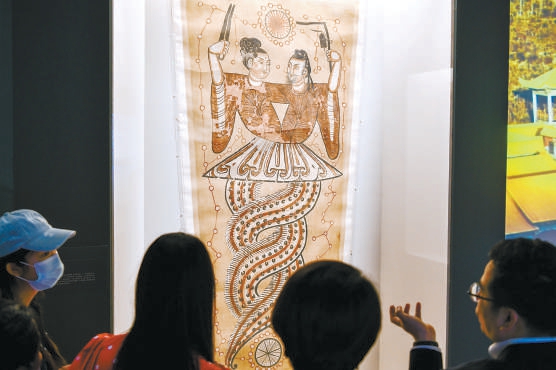 “交融匯聚——新疆精品歷史文物展”近日在國家博物館開幕。展覽展出新疆精品歷史文物209件(組),展現(xiàn)新疆各民族交往交流交融的歷史事實。圖為觀眾欣賞伏羲女媧絹畫。 本報記者 鄧偉攝