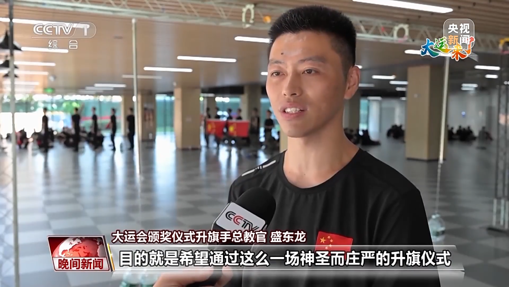 大運(yùn)會頒獎儀式升旗手總教官 盛東龍:目的就是希望通過一場神圣而莊嚴(yán)的升旗儀式來感染他們,來激發(fā)和增強(qiáng)他們的愛國情懷和使命擔(dān)當(dāng)。