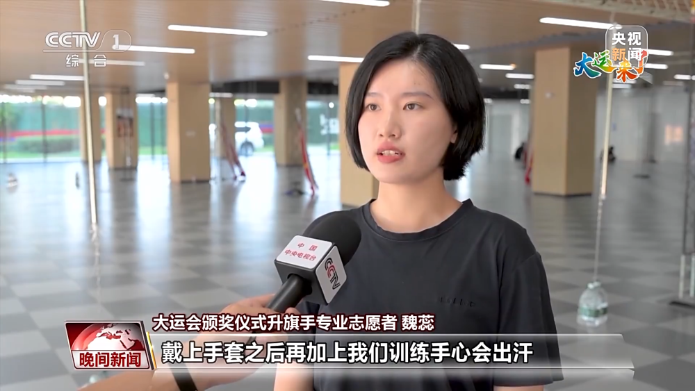 大運(yùn)會頒獎儀式升旗手專業(yè)志愿者 魏蕊:我們面對的是國旗。當(dāng)運(yùn)動員在運(yùn)動場上贏得屬于自己國家榮譽(yù)的時(shí)候,我們的工作就是幫他們詮釋好屬于他們自己的一份榮譽(yù)。