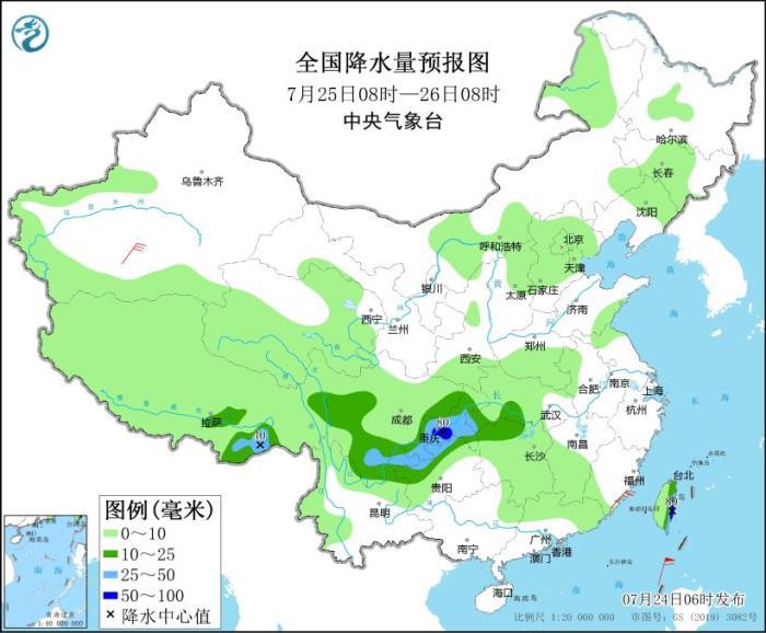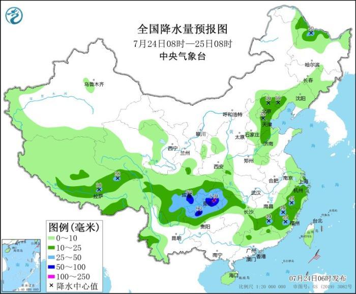 預(yù)計(jì),7月24日08時(shí)至25日08時(shí),四川盆地中南部、重慶大部、貴州北部、云南東北部、湖北西南部、湖南西北部以及浙江南部、福建中北部、江西南部、黑龍江北部、西藏東部等地部分地區(qū)有大到暴雨,其中,重慶南部等地局部地區(qū)有大暴雨(100~140毫米)。上述部分地區(qū)伴有短時(shí)強(qiáng)降水(最大小時(shí)降雨量30~50毫米,局地可超過(guò)70毫米),局地有雷暴大風(fēng)等強(qiáng)對(duì)流天氣。中央氣象臺(tái)7月24日06時(shí)繼續(xù)發(fā)布暴雨藍(lán)色預(yù)警。