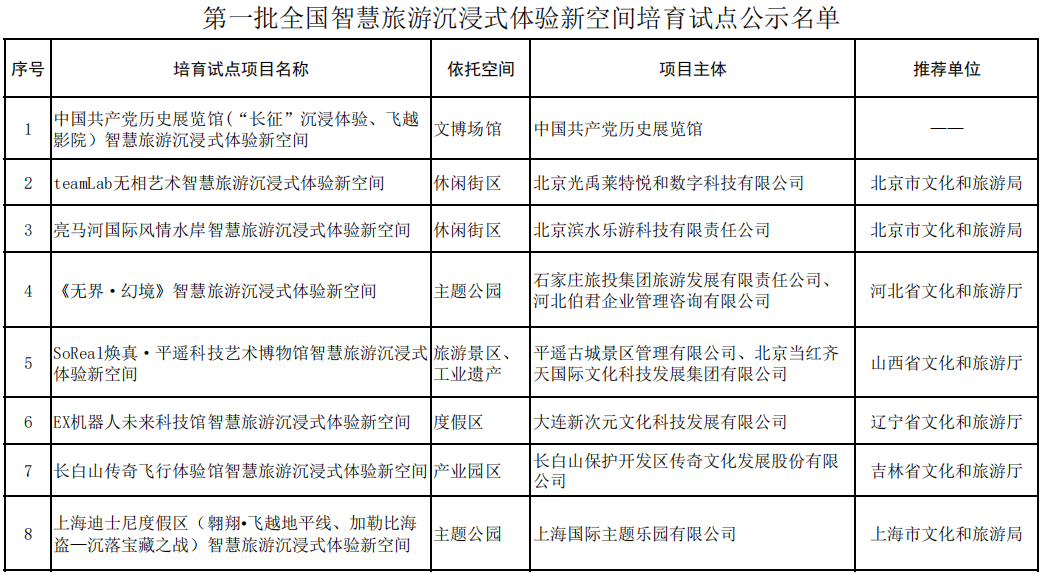 名單顯示,中國共產(chǎn)黨歷史展覽館(“長征”沉浸體驗(yàn)、飛越影院)智慧旅游沉浸式體驗(yàn)新空間、teamLab無相藝術(shù)智慧旅游沉浸式體驗(yàn)新空間、亮馬河國際風(fēng)情水岸智慧旅游沉浸式體驗(yàn)新空間等24個(gè)項(xiàng)目在列。