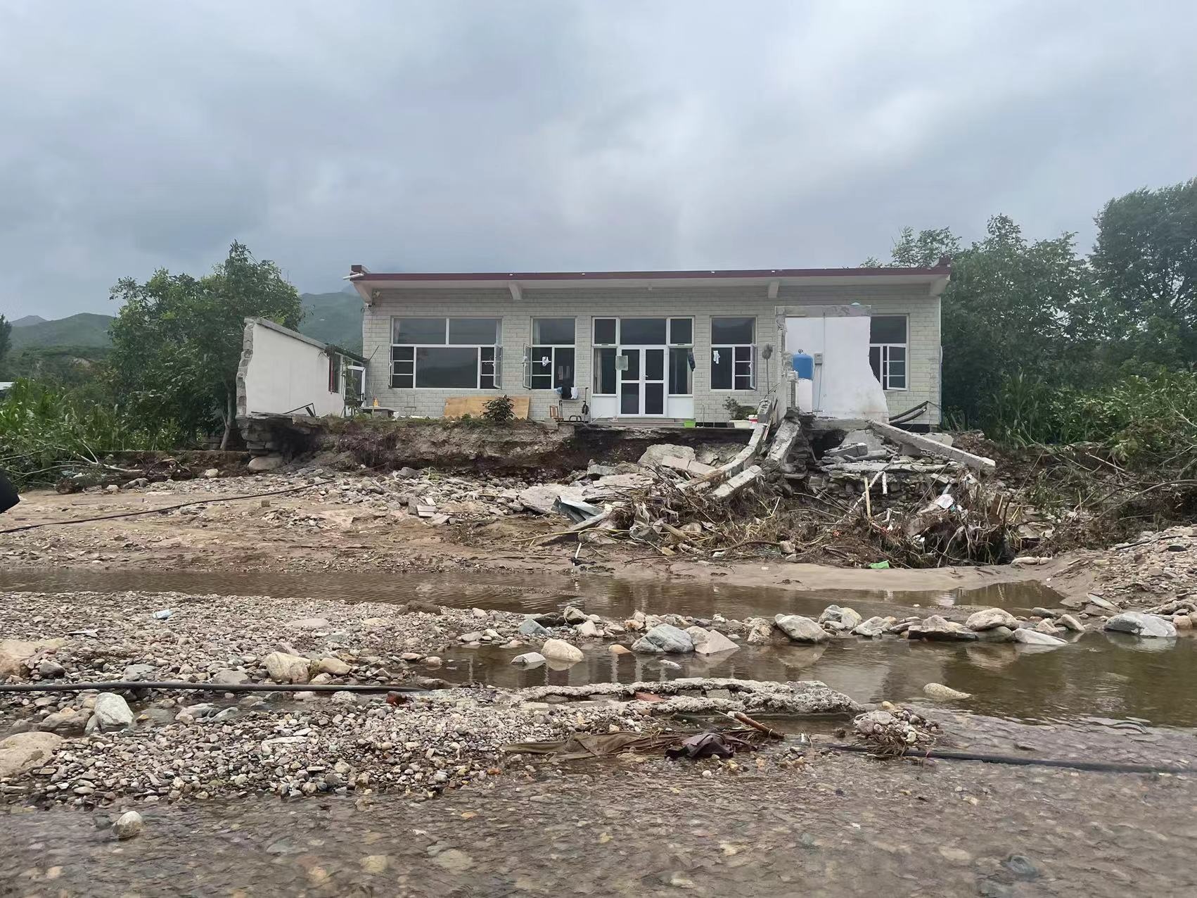 “根本來(lái)不及拿物品,房子的外墻就徹底塌了?!蹦緲?lè)說(shuō),一家人跑到馬路上后,看著家里的房子,無(wú)比后怕。“如果我們晚出來(lái)幾分鐘,或者睡在小房里,可能就被水沖走了?!?/p>