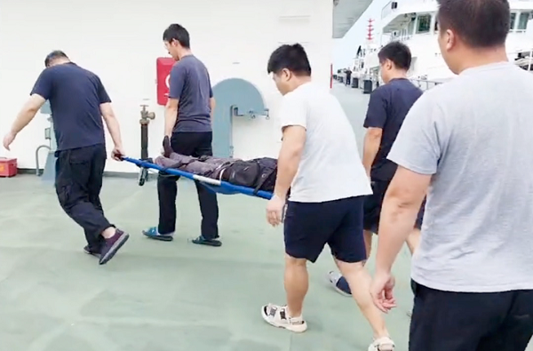 經(jīng)過綜合研判,船長康宜群決定立即放下吃水淺且航速快的船上小艇,克服涌浪帶來的困難,快速駛向求救漁船。9海里的距離,小艇僅用20分鐘便順利接到傷員,并第一時間送至呂四港2+2碼頭。