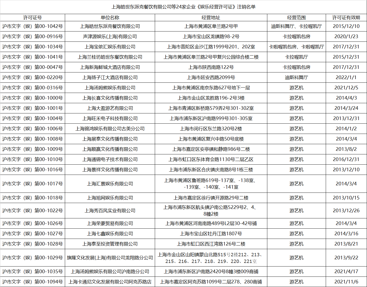 上海市24家企業(yè)被注銷《娛樂經(jīng)營許可證》