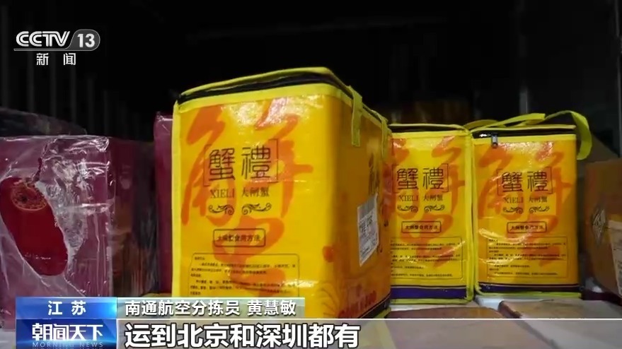 南通航空分揀員 黃慧敏:這批是來的鎮(zhèn)江郭莊來的大閘蟹,已經(jīng)開始分揀了,運到北京和深圳都有。