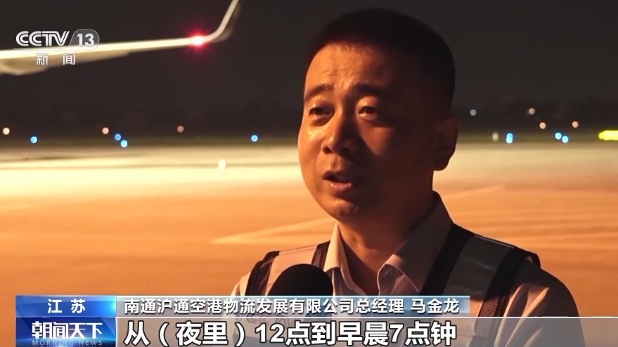 南通滬通空港物流發(fā)展有限公司總經(jīng)理 馬金龍:從夜里12點到早晨7點鐘,陸續(xù)有8個航班離港,目的站主要是廣州、深圳、北京幾個機(jī)場。