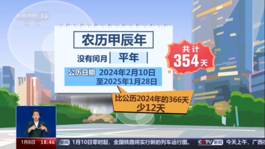 即將到來(lái)的農(nóng)歷甲辰年沒有閏月,因此是一個(gè)平年,其對(duì)應(yīng)的公歷日期為2024年2月10日至2025年1月28日,共計(jì)354天。所以比公歷2024年的366天少了12天。