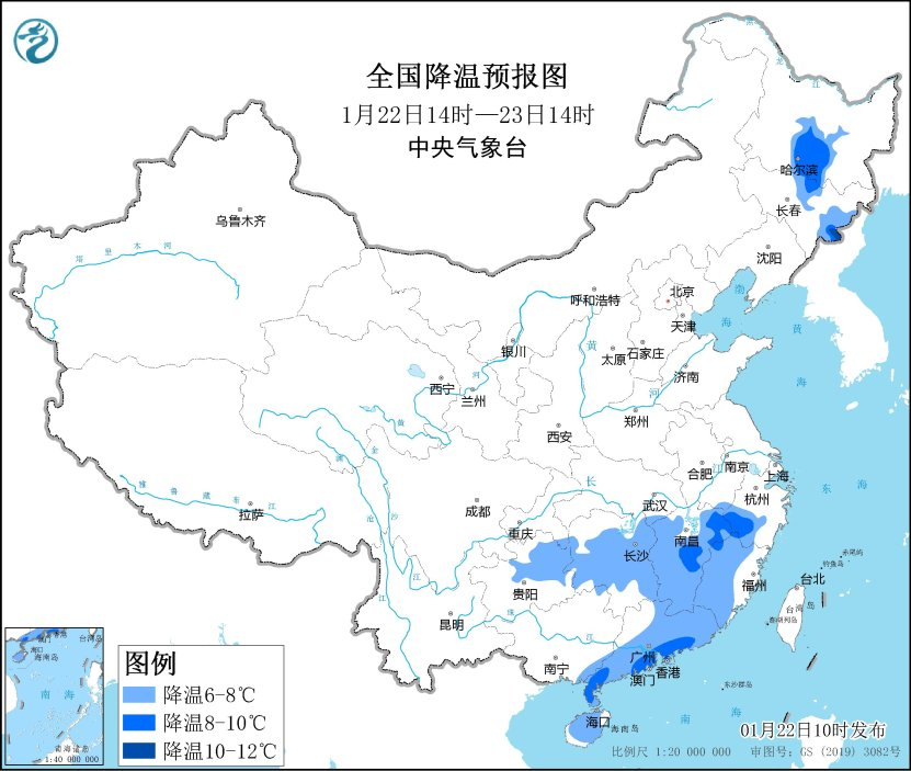 受寒潮影響,預(yù)計,1月22日14時至1月23日14時,黑龍江中部、吉林中東部、貴州東部、湖南中南部、江西、浙江西部、福建中西部、廣東東部和南部等地將降溫6~8℃,局地降溫超過9~10℃。23日至24日,最低氣溫0℃線將南壓到廣西北部和廣東北部一帶,江南、華南北部、貴州等地的最低氣溫可達(dá)-8~-1℃,華南中南部可達(dá)0~8℃。