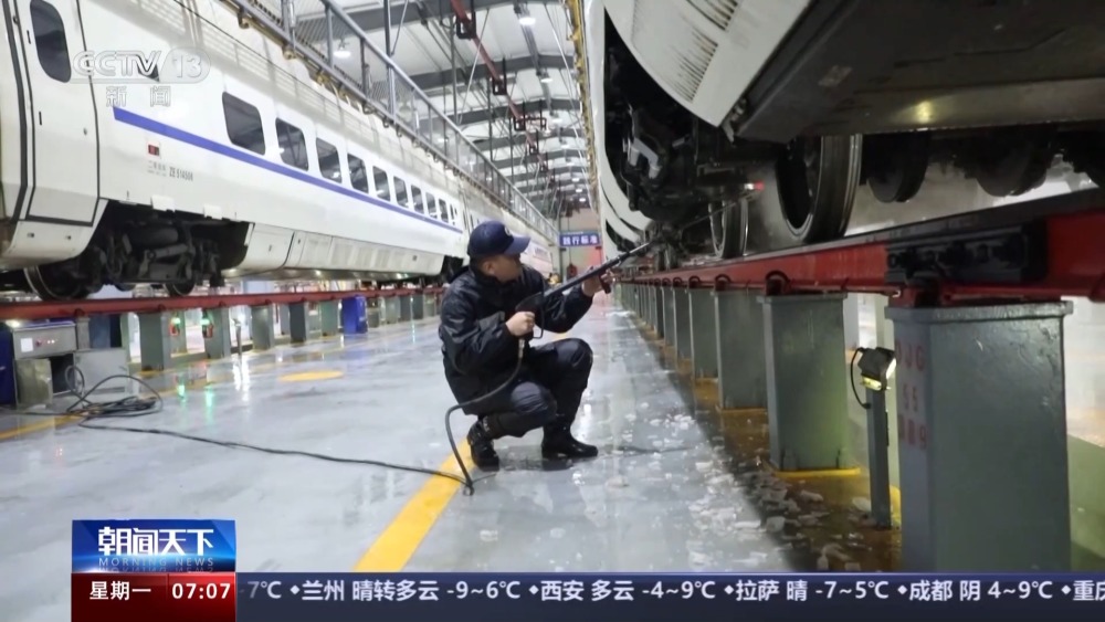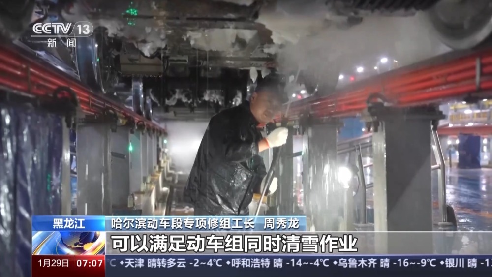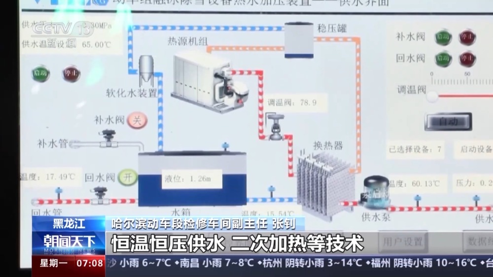 哈爾濱動車段檢修車間副主任 張釗:設備的迭代主要體現(xiàn)在集中適時加熱、恒溫恒壓供水、二次加熱等技術(shù),能夠滿足整列動車組清冰除雪需求。