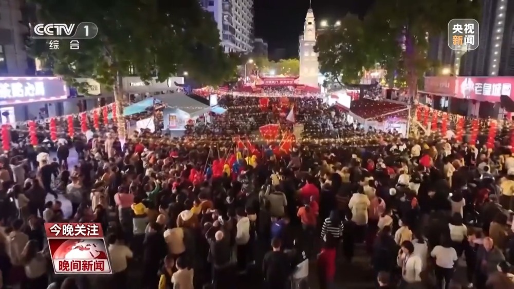 民俗踩街上演 花燈燈光秀點(diǎn)亮街道