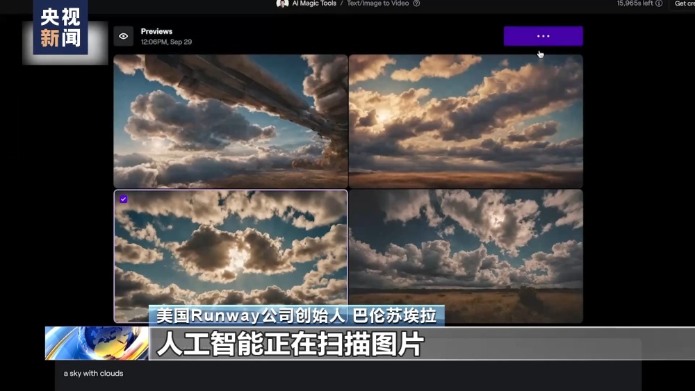 美國Runway公司創(chuàng)始人 巴倫蘇埃拉:讓我們做一個(gè)有云的天空,我可以選擇電影風(fēng)格或預(yù)覽角度。我真的很喜歡這張,它看起來就像光是從云里出來的。人工智能正在掃描圖片,并由此生成一段視頻。你現(xiàn)在可以看到云正在移動,天空正在變暗,暴風(fēng)雨就要來了。