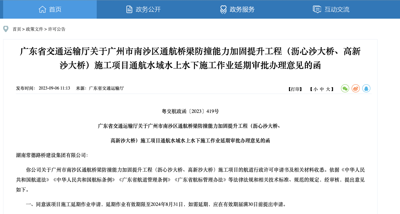 2023年9月,廣東省交通運(yùn)輸廳又發(fā)布瀝心沙大橋、高新沙大橋防撞加固工程延期審批意見,文件中稱“同意該項(xiàng)目施工延期作業(yè)申請(qǐng),延期作業(yè)有效期限至2024年8月31日”。