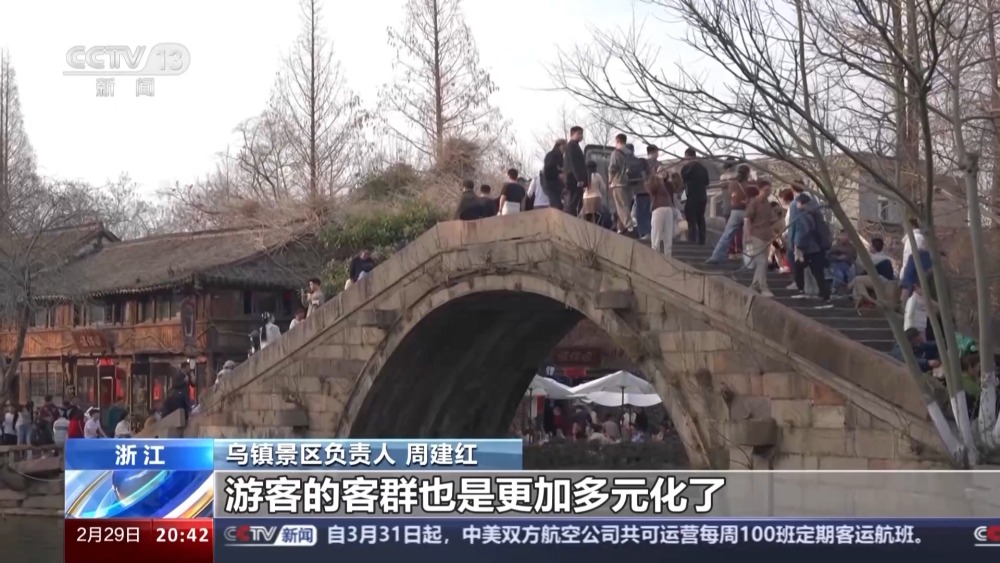 烏鎮(zhèn)景區(qū)負(fù)責(zé)人 周建紅:二月份來(lái)看,我們整個(gè)線上營(yíng)銷比例已經(jīng)超過(guò)了線下,占比達(dá)到了60%,旅游產(chǎn)品也是在做不斷的一個(gè)迭代,游客的客群也是更加多元化了。十年前的春節(jié),游客量在20多萬(wàn),那這一次的春節(jié)的話,我們已經(jīng)是突破了50萬(wàn)人次,也是翻倍的一個(gè)增長(zhǎng)。