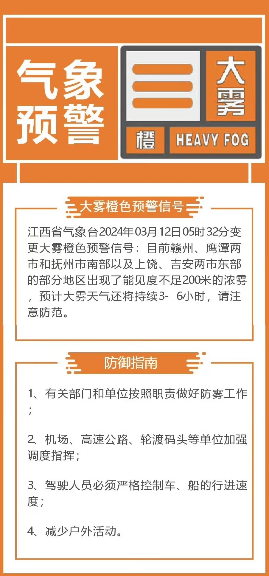 江西省氣象臺2024年3月12日5時32分變更大霧橙色預(yù)警信號:目前贛州、鷹潭兩市和撫州市南部以及上饒、吉安兩市東部的部分地區(qū)出現(xiàn)了能見度不足200米的濃霧,預(yù)計大霧天氣還將持續(xù)3~6小時,請注意防范。