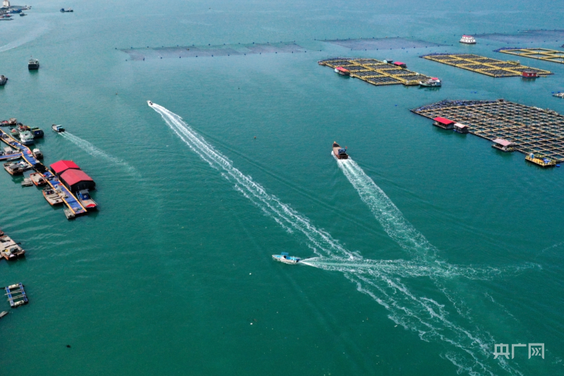 養(yǎng)殖工人駕駛漁船在養(yǎng)殖區(qū)穿梭(央廣網發(fā) 王旺旺 攝)