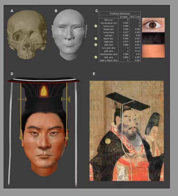 復(fù)旦大學(xué)科技考古研究院文少卿團隊用專門適用于古DNA的捕獲探針,從北周武帝肢骨樣本上獲取了約100萬個可用的基因位點,還原北周武帝頭發(fā)、皮膚、瞳孔等關(guān)鍵特征。經(jīng)過6年的反復(fù)嘗試,終于“描繪”出宇文邕頭像。