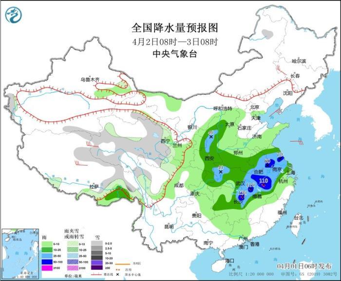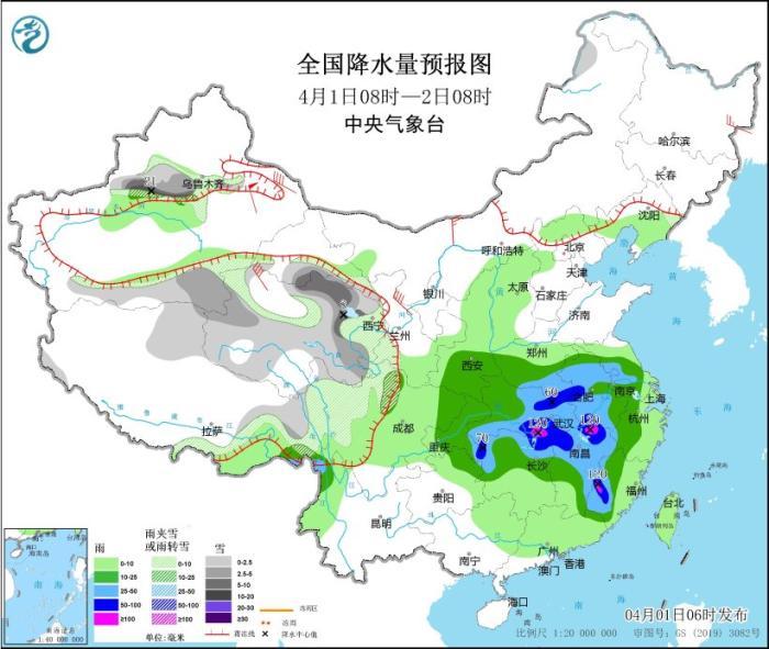 4月1日08時至2日08時,新疆沿天山地區(qū)和南疆盆地、西藏北部和東部、青海大部、川西高原北部等地部分地區(qū)有小到中雪或雨夾雪,其中,新疆沿天山地區(qū)和南疆盆地、青海東北部等地部分地區(qū)有大到暴雪,新疆沿天山地區(qū)局地大暴雪(20~21毫米)。陜西東南部、河南中南部、安徽大部、江蘇中西部、四川東部、重慶大部、貴州東北部、湖北、湖南中北部、江西大部、浙江中西部、福建中西部等地部分地區(qū)有中到大雨,其中,河南南部、安徽中南部、湖北東部和南部、湖南北部和西部、江西北部和東南部、福建西部、重慶東南部等地部分地區(qū)有暴雨,局地大暴雨(100~120毫米)。內蒙古西北部、新疆東部、青海西部、甘肅河西等地部分地區(qū)有4~6級風,其中,新疆東部部分地區(qū)有7~8級風,山口風力可達11級以上。