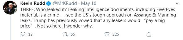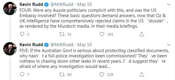 5月10日,陸克文在社交媒體再次連發(fā)五問,質(zhì)疑可能參與此次“甩鍋中國(guó)”事件的各方。他的第一問稱,這所謂的15頁(yè)“情報(bào)”,究竟是源于真實(shí)的絕密情報(bào),還是根據(jù)公開信息拼湊而成?他表示,“伊拉克戰(zhàn)爭(zhēng)的教訓(xùn)早已告誡媒體,必須謹(jǐn)慎對(duì)待所謂的‘情報(bào)’,以防陷入某種政治目的之中。”