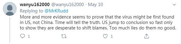 也有網(wǎng)友說,“越來越多的證據(jù)似乎證明,該病毒首先出現(xiàn)在美國(guó),而不是中國(guó)?!薄懊绹?guó)如此迅速地得出結(jié)論,只是表明他們迫切希望轉(zhuǎn)移責(zé)任。”