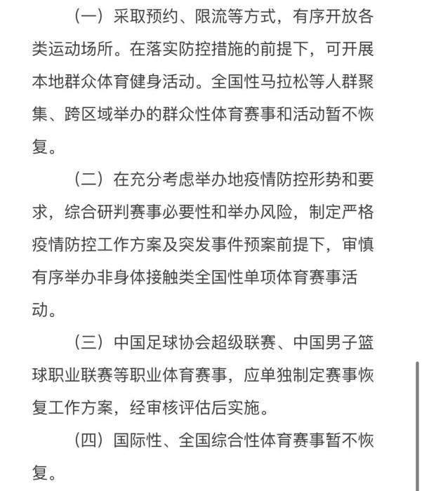 體育總局:中超、CBA等應單獨制定賽事恢復工作方案