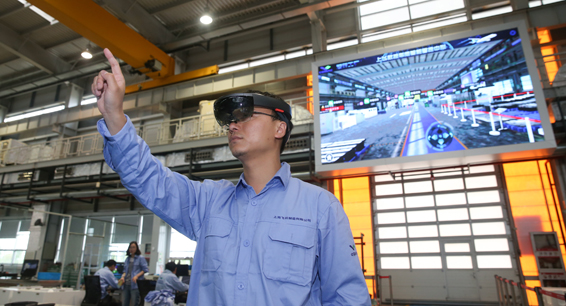 中國商飛公司總裝制造中心智慧數(shù)控車間主要承擔飛機零部件的研制、生產(chǎn)工作,其產(chǎn)品用于C919大型客機、ARJ21新支線客機。圖為工作人員在中國商飛公司總裝制造中心智慧數(shù)控車間使用AR眼鏡操控虛擬電子屏幕。新華社記者 丁汀 攝