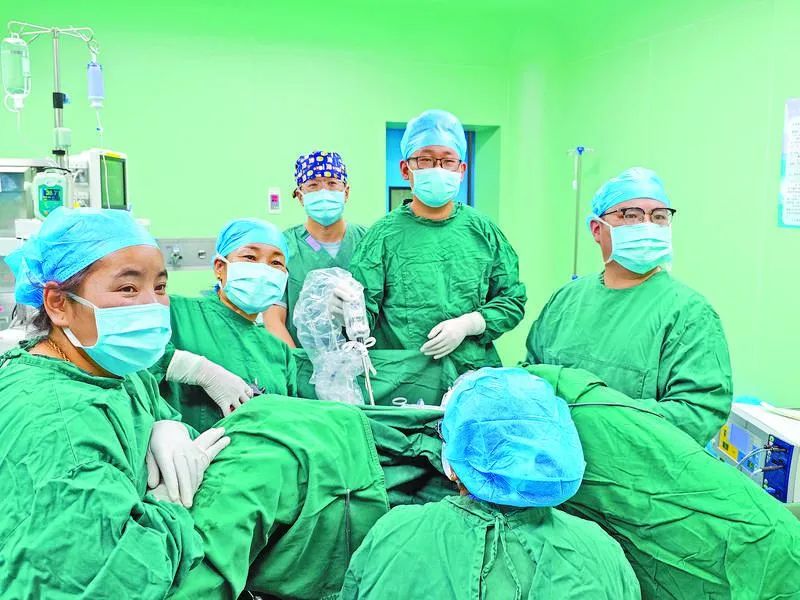 上海援藏醫(yī)療專(zhuān)家隋孟松(右一)帶領(lǐng)本地婦科醫(yī)生開(kāi)展日喀則市首例腹腔鏡下全子宮切除手術(shù)。