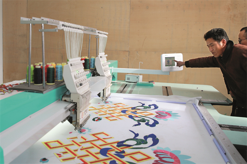 洛隆縣博織利民服飾有限公司總經(jīng)理向巴在操作電子刺繡機(jī)刺繡帳篷上的花紋圖案。陳衛(wèi)國 攝