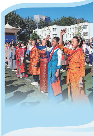 拉薩北京實驗中學(xué)學(xué)生在北京市順義區(qū)第五中學(xué)參加升旗儀式。馬瀟雅攝