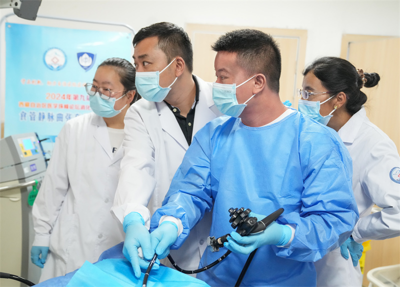 7月8日,在西藏日喀則市人民醫(yī)院,第九批醫(yī)療人才“組團式”援藏專家、復(fù)旦大學(xué)附屬中山醫(yī)院內(nèi)鏡中心副主任醫(yī)師胡健衛(wèi)(左二)指導(dǎo)徒弟張武(左三)進行內(nèi)鏡手術(shù)。新華社記者 丁汀 攝/新華社圖片庫