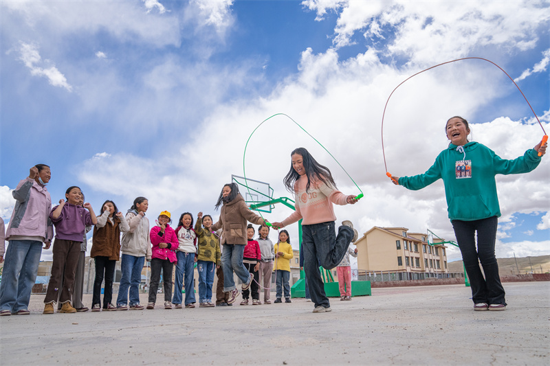 6月22日,西藏那曲市班戈縣中石化小學(xué)學(xué)生在操場上跳繩。作為目前全國海拔最高的援藏小學(xué),班戈縣中石化小學(xué)有“離天空最近的援藏小學(xué)”之稱。新華社記者 丁增尼達 攝/新華社圖片庫