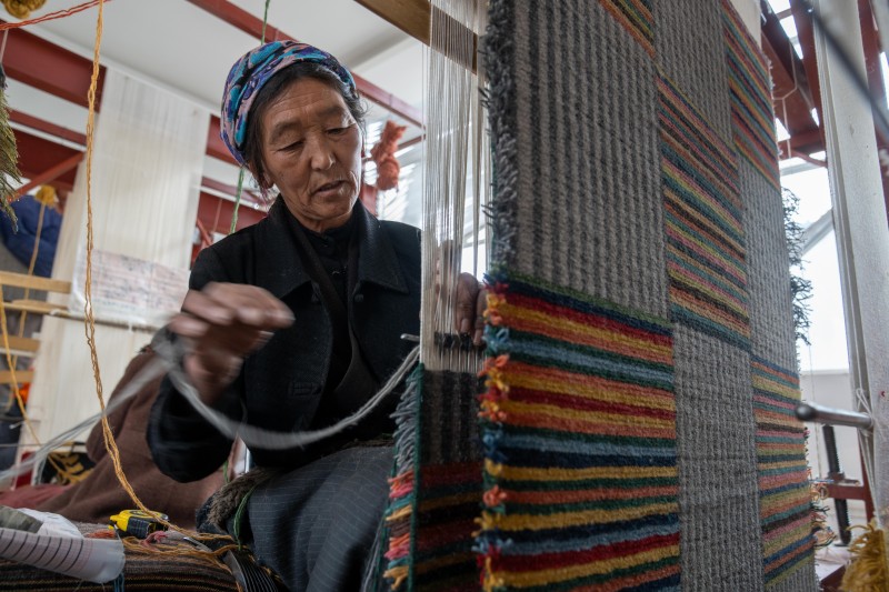 2月22日,一名婦女在編織藏毯。西藏山南市瓊結(jié)縣通過援藏力量招商引資,成立公司生產(chǎn)純手工藏毯,同時還聘請藏毯手工藝人,為當(dāng)?shù)厝罕娊淌诰幙椉妓嚕貙掁r(nóng)牧民增收渠道。新華社記者 旦增尼瑪曲珠 攝/新華社圖片庫