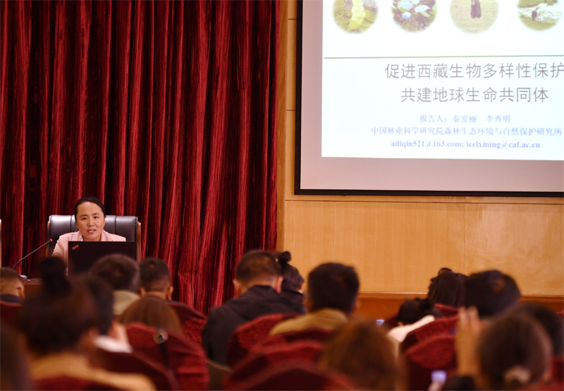 2023年9月5日,以西藏生物多樣性保護科普暨生態(tài)護林員探訪傳播為主題的林草科普援藏活動在西藏拉薩舉行,中國林業(yè)科學(xué)研究院副研究員秦愛麗為與會人員作生物多樣性保護知識講座。新華社記者 張汝鋒 攝/新華社圖片庫