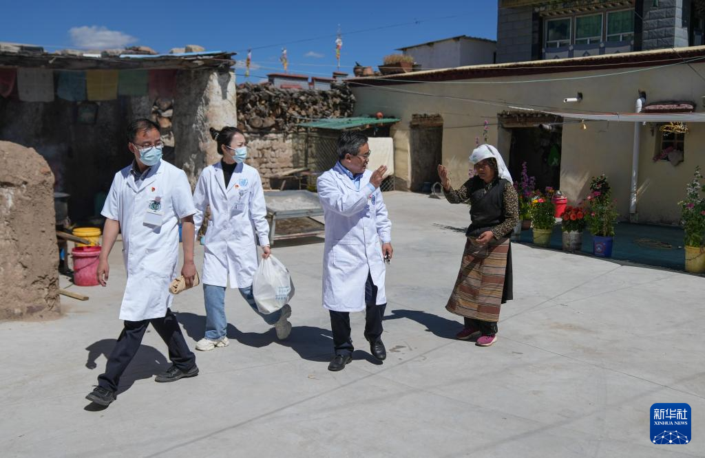 8月30日,熊海醫(yī)生(后右)和強嘎鄉(xiāng)衛(wèi)生院的康卓桑姆一同為患者檢查身體??底可D吩俏鞑卮髮W醫(yī)學院學生,在這次義診中又碰到了曾經的老師。新華社記者 晉美多吉 攝