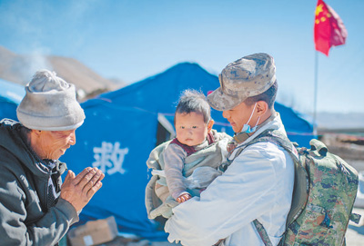 1月9日,在定日縣長所鄉(xiāng)古榮村安置點,受災群眾感謝西藏軍區(qū)陸軍某部隊衛(wèi)生員的醫(yī)療救治。人民網(wǎng)記者 翁奇羽攝