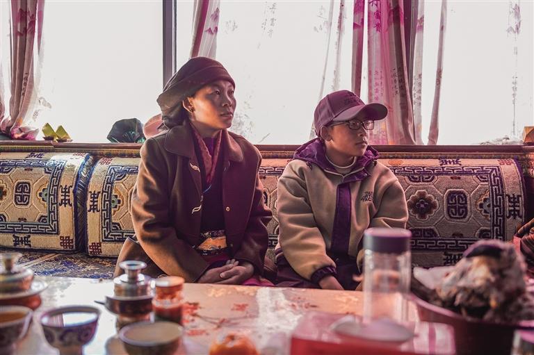 當(dāng)日,天空晴朗,在廣袤無(wú)垠、無(wú)樹木遮擋的曠野上,稍起一陣疾風(fēng),便會(huì)揚(yáng)起一層薄薄的黃沙。從村委會(huì)出發(fā),沿著冰湖畔的水泥小路前行,很快就來(lái)到了村民倫珠曲珍的家。一進(jìn)屋,厚實(shí)的木門便將凜冽的寒風(fēng)擋在了門外?!翱煺?qǐng)進(jìn),這幾天風(fēng)沙有點(diǎn)大,普莫雍措都沒(méi)以前藍(lán)了?!眰愔榍湟贿呹P(guān)門一邊熱情地笑著說(shuō)道。