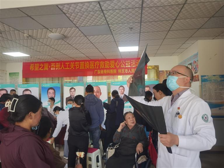 廣東援藏醫(yī)生在百例人工關(guān)節(jié)置換醫(yī)療救助愛心公益活動(dòng)中查看片子。