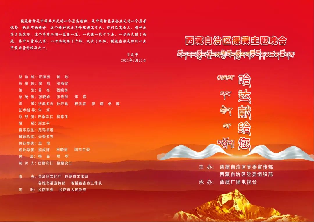為展現援藏工作成就,弘揚援藏精神,表達西藏各族干部群眾對習近平總書記和黨中央的親切關懷、全國人民無私支援特別是對援藏干部人才的敬意和感恩之情,由自治區(qū)黨委宣傳部、自治區(qū)黨委組織部共同主辦的援藏主題晚會《哈達獻給您》將于8月18日晚,在西藏衛(wèi)視(《西藏新聞聯播》后)、西藏藏語衛(wèi)視(19:30左右)播出,自治區(qū)七地市廣播電視臺將同步播出(地市《新聞聯播》后)。