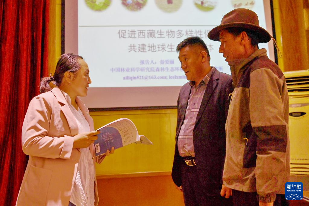 9月5日,中國林業(yè)科學(xué)研究院副研究員秦愛麗(左)同曲水縣協(xié)榮村林長多吉(中)、護(hù)林員西洛次仁交流。新華社記者 張汝鋒 攝