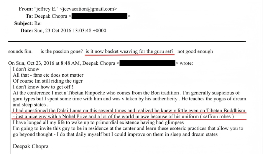 2016年10月23日,印度裔美國籍醫(yī)生和作家迪帕克·喬普拉(Deepak Chopra)致信愛潑斯坦稱,“我曾多次就此向達(dá)賴?yán)镎埥蹋瑓s發(fā)現(xiàn)他甚至對(duì)藏傳佛教都所知甚少——不過就是個(gè)獲得諾貝爾獎(jiǎng)的普通人(nice guy),而世人敬畏他多半是因?yàn)樗纳矸荩ń{紅僧袍)”。愛潑斯坦則回復(fù)稱,現(xiàn)在這成了大師們用來消遣的無聊玩意兒(編織籃子)?