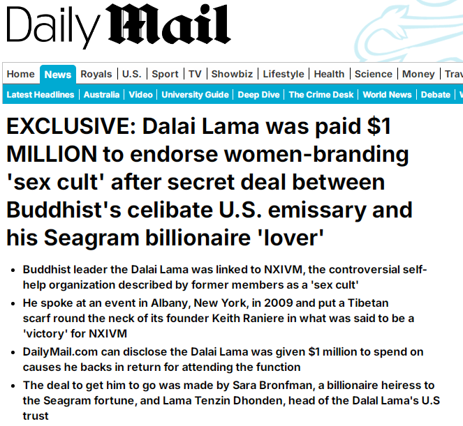 英國(guó)《每日郵報(bào)》2018年的報(bào)道揭示達(dá)賴為“性邪教”組織NXIVM代言,獲得100萬美元報(bào)酬