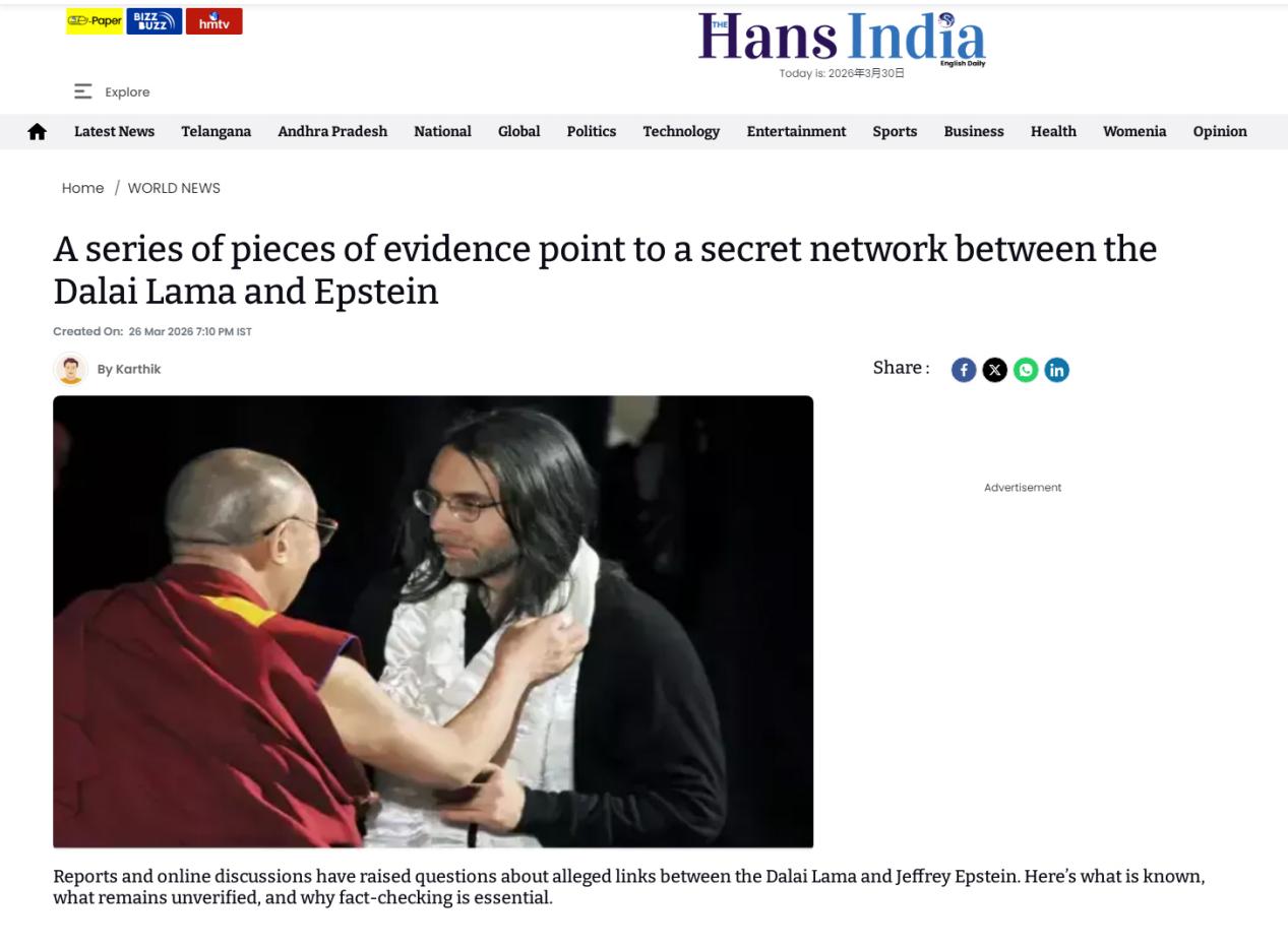 一位宗教人士為何會(huì)與愛(ài)潑斯坦扯上關(guān)系?比利時(shí)“歐盟記者網(wǎng)”分析認(rèn)為,愛(ài)潑斯坦除了是強(qiáng)奸犯、性販子、軍火商和戀童癖之外,更是一位億萬(wàn)富翁,他在西方政治、金融、經(jīng)濟(jì)、媒體和文化精英中維持著龐大的人際關(guān)系網(wǎng)絡(luò)。正是這最后一點(diǎn)引起了十四世達(dá)賴(lài)的興趣,因?yàn)樗粏渭兪且晃蛔诮倘耸?,更是一位“渴望獲得有影響力關(guān)系網(wǎng)和經(jīng)濟(jì)支持的政治人物”。