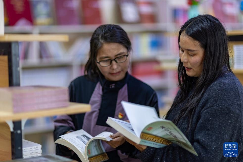 4月23日,墨脫縣新華書店經(jīng)理桑旦卓瑪(右)在店內(nèi)向顧客推介圖書。新華社記者 姜帆 攝