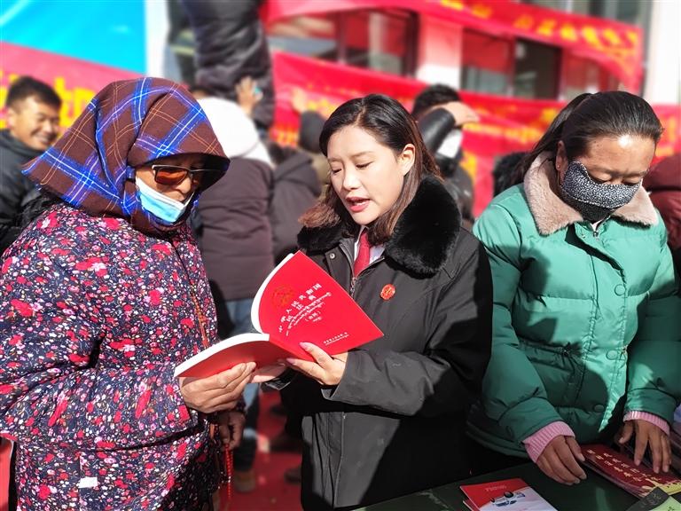 圖為安多縣“青藏線雪蓮護(hù)家隊”在帕那鎮(zhèn)第六小區(qū)向婦女群眾進(jìn)行普法宣傳。記者 姚海全 候朋飛 攝