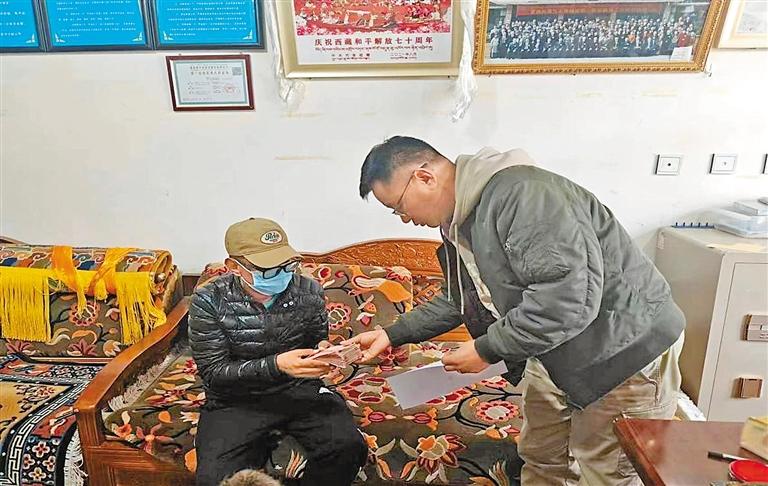 拉薩市沖賽康社區(qū)工作人員將幫扶慰問(wèn)金送到困難黨員拉巴次仁手中。記者 央金 攝