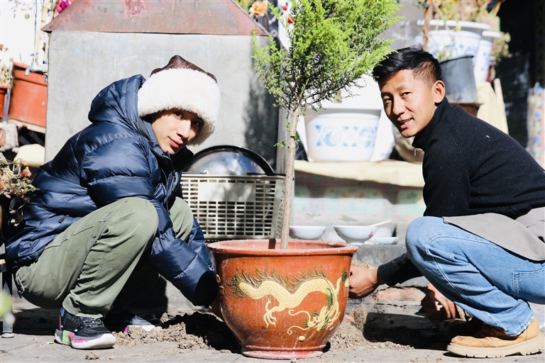 旦增特覺(jué)(右)和旦增格桑(左)正在移栽新買的青松樹(shù)。記者 格桑倫珠 央金 攝