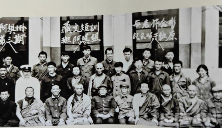 圖為阿壩州第三期藏文短訓(xùn)班時(shí)阿壩組與毛爾蓋·桑木旦合影(圖片由作者提供)