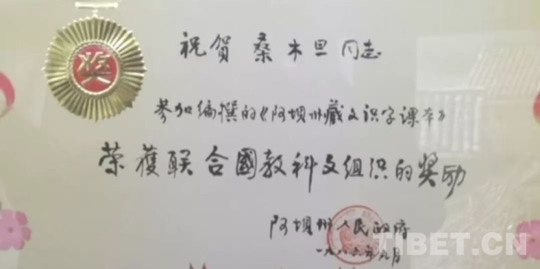 作為一個(gè)智慧過(guò)人的學(xué)者,1986年9月,為了藏語(yǔ)文教育的進(jìn)一步普及,毛爾蓋·桑木旦不僅為掃盲四處奔跑,講授藏語(yǔ)文基礎(chǔ)課,而且主編了《藏文掃盲課本》,此書由國(guó)家教委推薦參加了亞太地區(qū)掃盲教材比賽,并榮獲聯(lián)合國(guó)教科文組織的獎(jiǎng)勵(lì)。為此阿壩州人民政府頒發(fā)證書,祝賀桑木旦同志榮獲聯(lián)合國(guó)教科文組織的獎(jiǎng)勵(lì)。我相信中國(guó)藏學(xué)界獲得此獎(jiǎng)?wù)撸珷柹w·桑木旦先生為第一人。