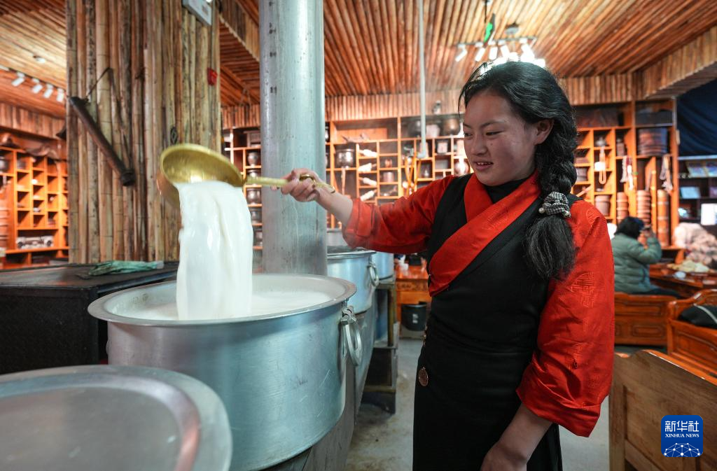 “牧人寶庫(kù)”藏式茶館服務(wù)員在熬制奶茶(2月13日攝)。新華社記者 晉美多吉 攝